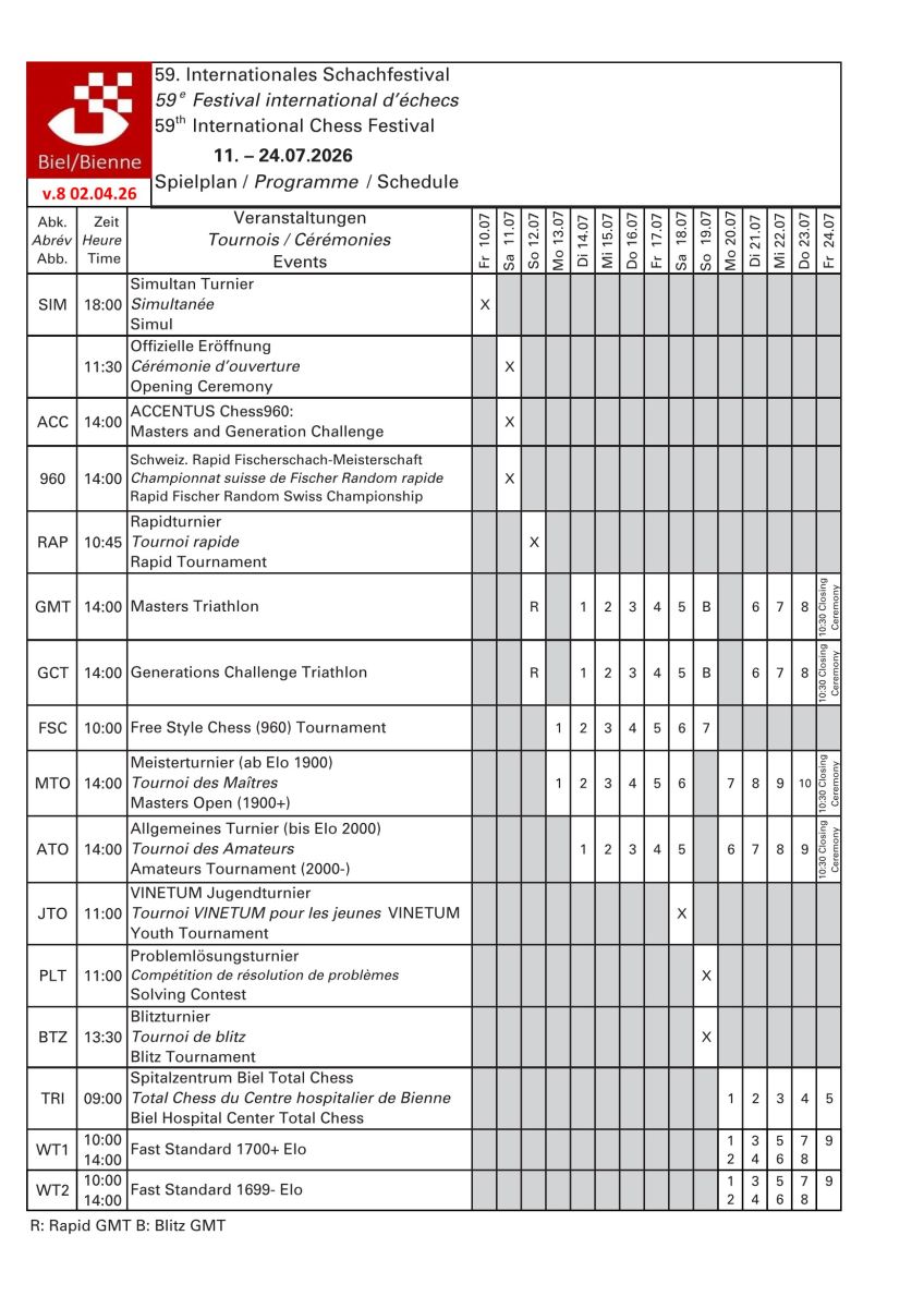 La deuxième semaine du Festival, les joueurs qui veulent profiter du soleil l’après-midi, ou qui sont engagés dans le ATO ou le MTO, opteront pour le Total Chess du Centre hospitalier de Bienne, un triathlon d’échecs (TRI), avec chaque matin un match combinant une partie rapide (10’+5’’) + une partie de blitz (3’+2’’) + une fast-standard (60’+30’’).