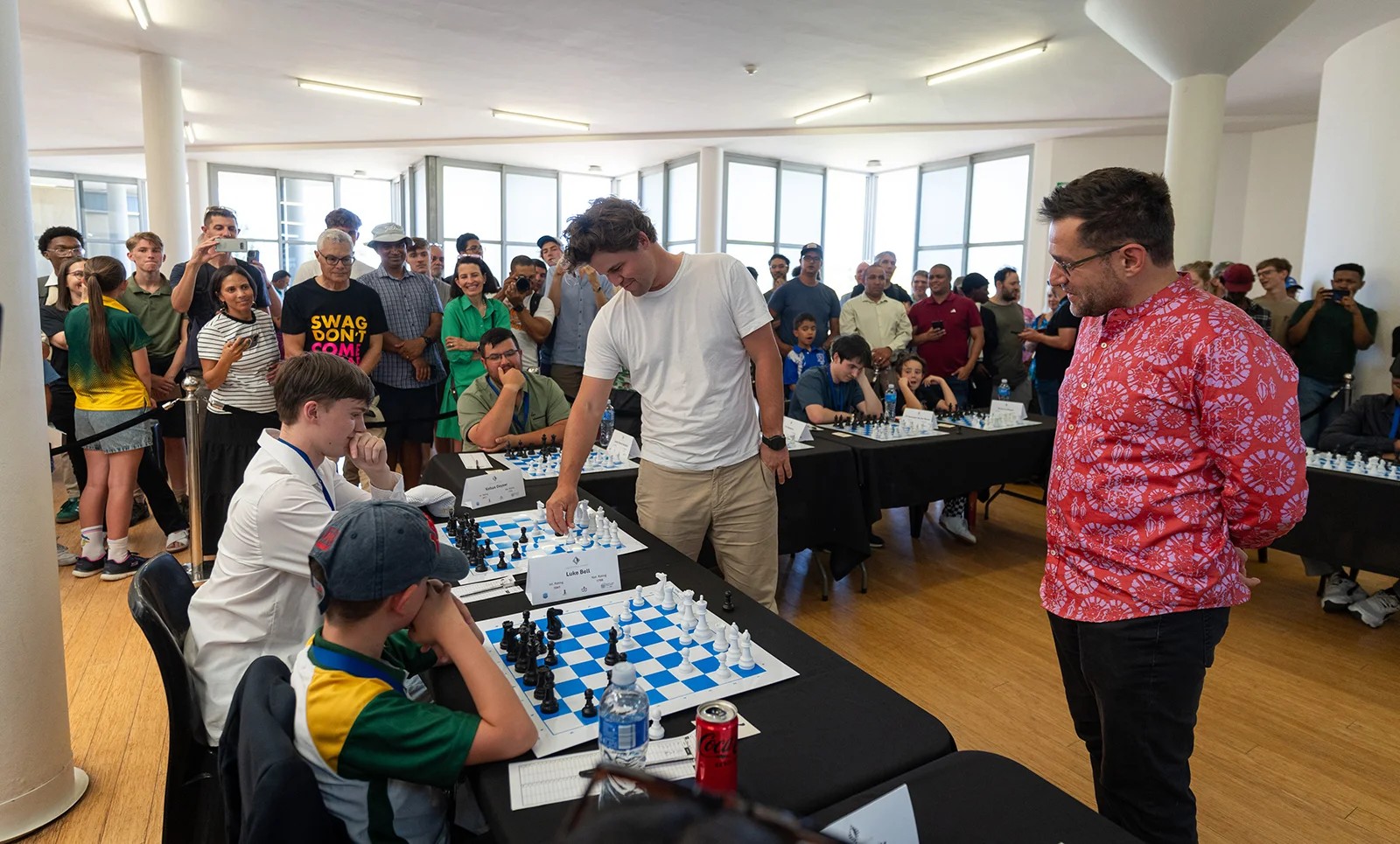 Magnus Carlsen (Norvège) et Levon Aronian (USA) ont joué une simultanée en tandem, alternant les coups contre 20 échiquiers, remportant 15 parties, faisant une nulle et en perdant quatre (!).