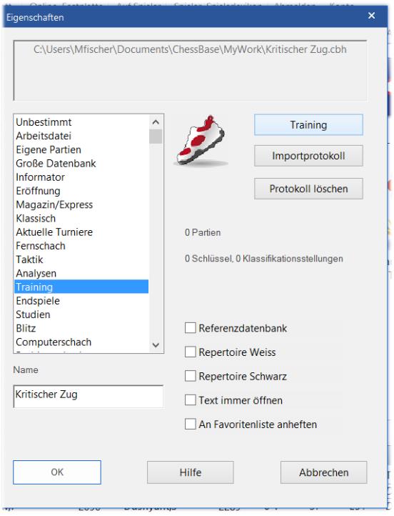 La première étape consiste donc à faire Ctrl+X qui vous propose d'enregistrer une "nouvelle base de données". Une fois cela fait, vous cliquez droit sur elle et choisissez Propriétés. Dans le menu déroulant, vous sélectionnez Entraînement: