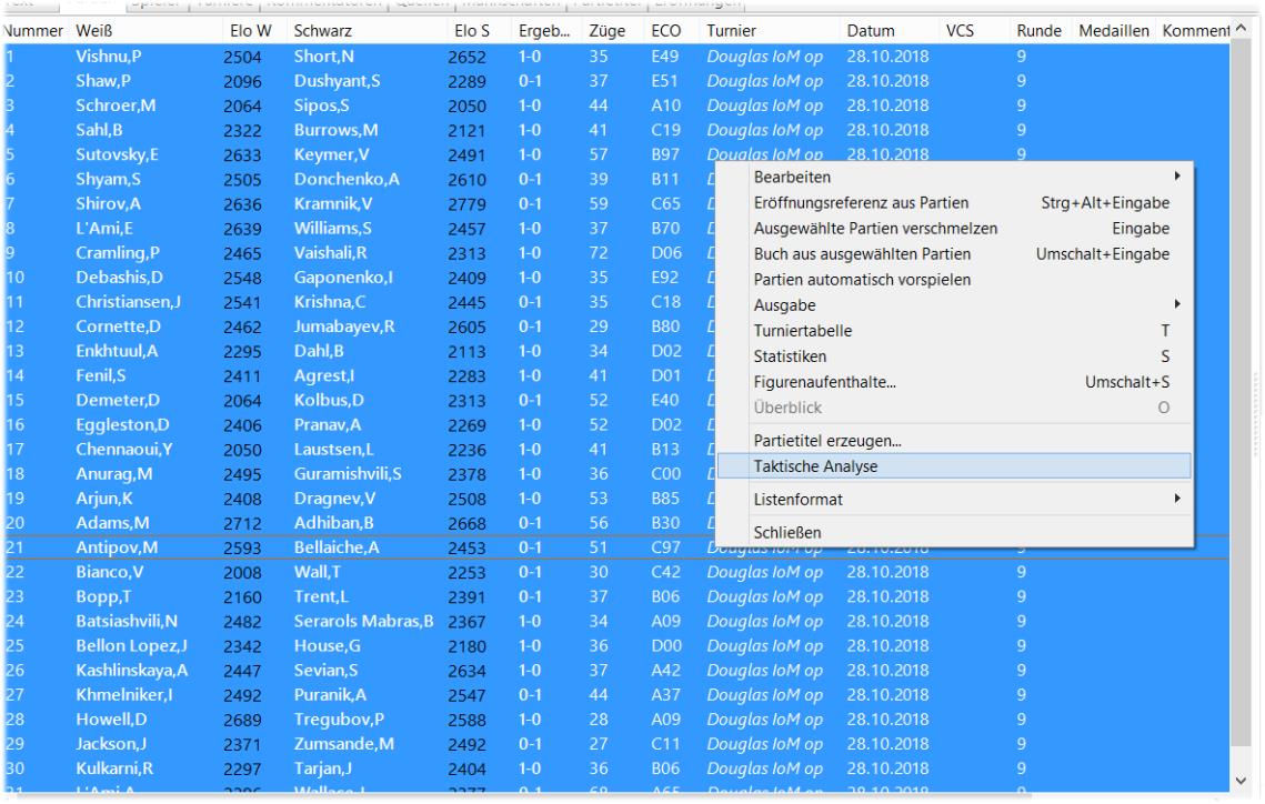 Dans la base de données contenant les parties de l'open, on sélectionne celles qui nous intéressent, puis, d'un clic droit, on choisit l'option "Analyse tactique":