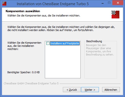 Cliquez sur le ficher "ChessBaseEndgameTurboSetup.exe" et choisissez votre langue. Puis cliquez sur Suivant. Une nouvelle boîte de dialogue apparaît; mettez un vu dans la case "Installer sur le disque dur" et cliquez sur Suivant: